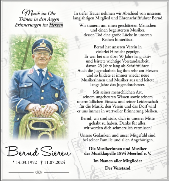 Mit Bernd verlieren wir einen lieben Menschen, tollen Kameraden und begeisterten Musiker.